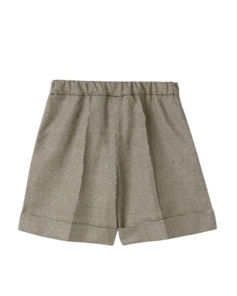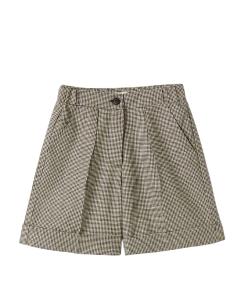 Bermuda con pince da bambina realizzati in fantasia pied-de-poule intarsiato con filo lurex. Presentano vita elasticizzata sul retro, chiusura frontale con bottone e zip, tasche laterali all'americana e orlo con risvolto.