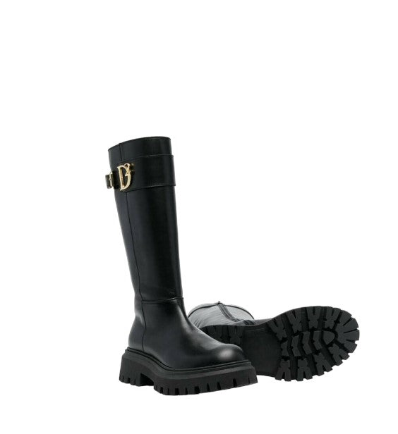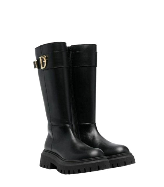 Dsquared2 boots with gold metal logo initial buckle on the shaft.