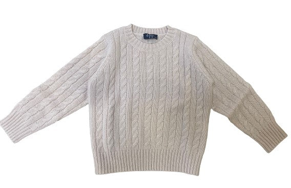 Crew neck sweater with cable motif, ribbed collar, hem and cuffs.