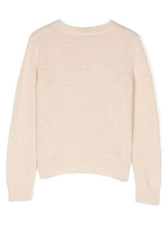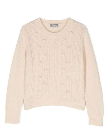 Crew neck wool sweater, cable pattern with pom pom appliqué on the front.