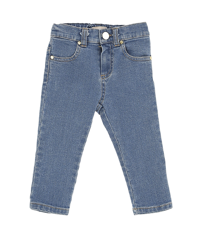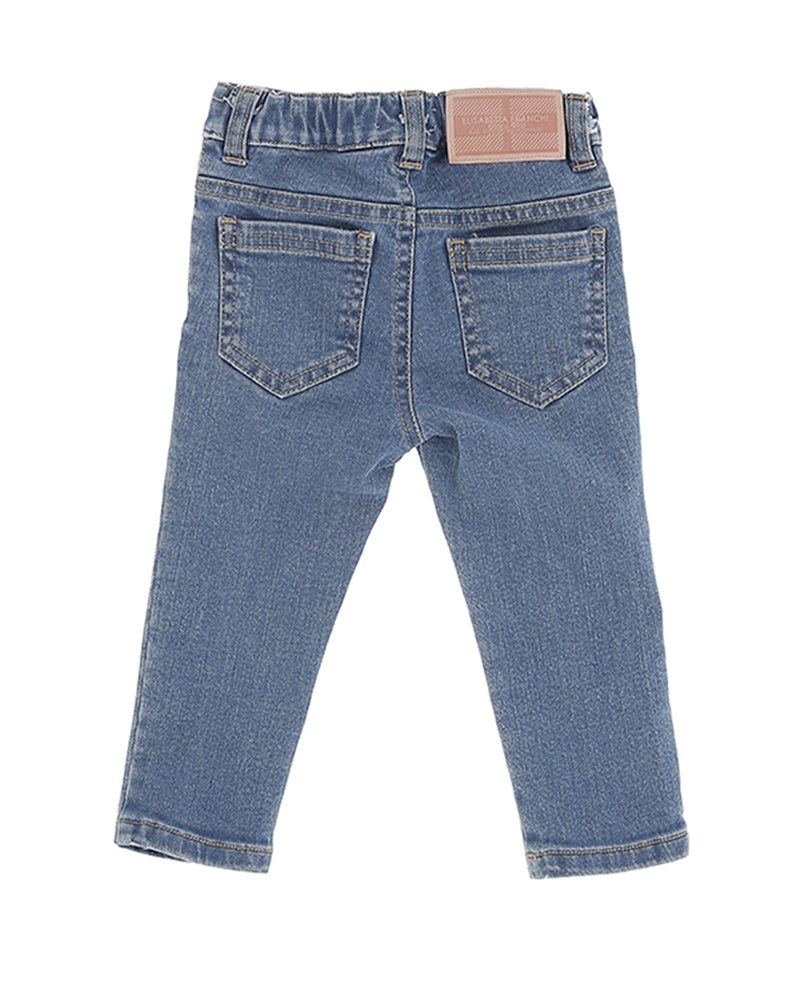 Jeans realizzati in denim di cotone stretch, modello cinque tasche. Presentano chiusura frontale con bottone e zip, passanti per cintura, vita elasticizzata sul retro e patch logo sulla parte posteriore.