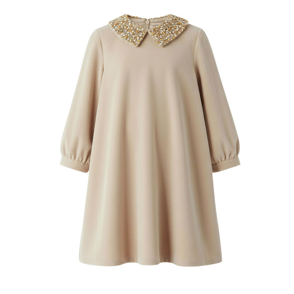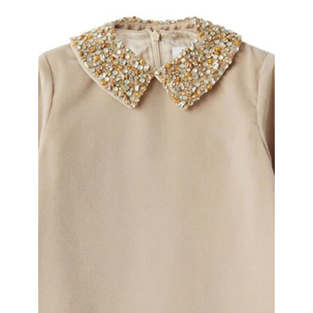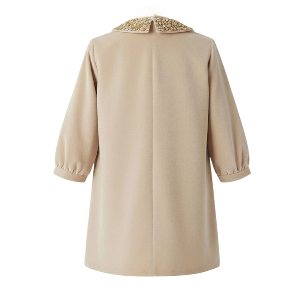 Abito a trapezio dalla linea dritta realizzato in velluto liscio. Presenta colletto rimovibile con strass e perline, maniche lunghe, zip a scomparsa sul retro e fodera interna in misto viscosa.