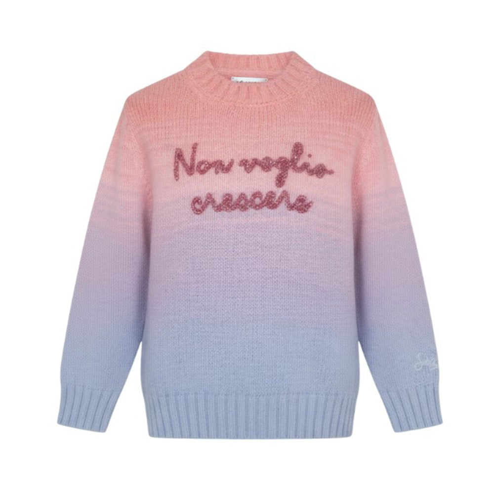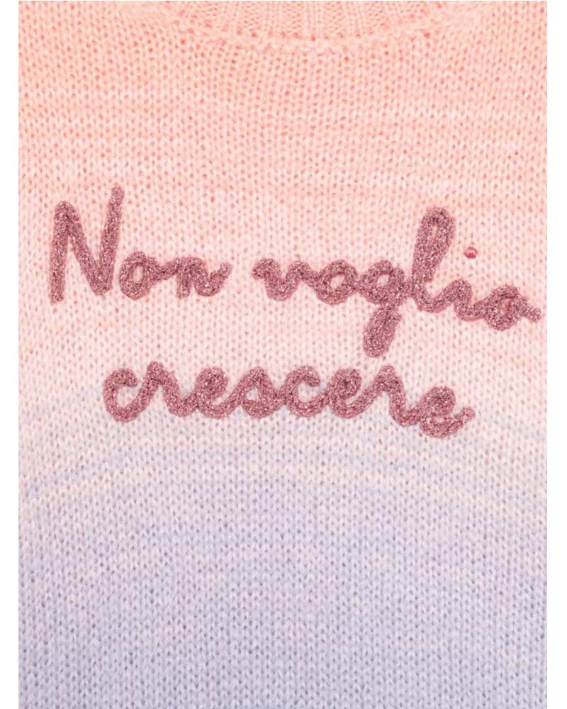 Maglia Jessie realizzata in misto mohair da bambina. Presenta collo rotondo, maniche lunghe e finiture a coste. È decorata con ricamo glitter Non Voglio Crescere sul davanti.