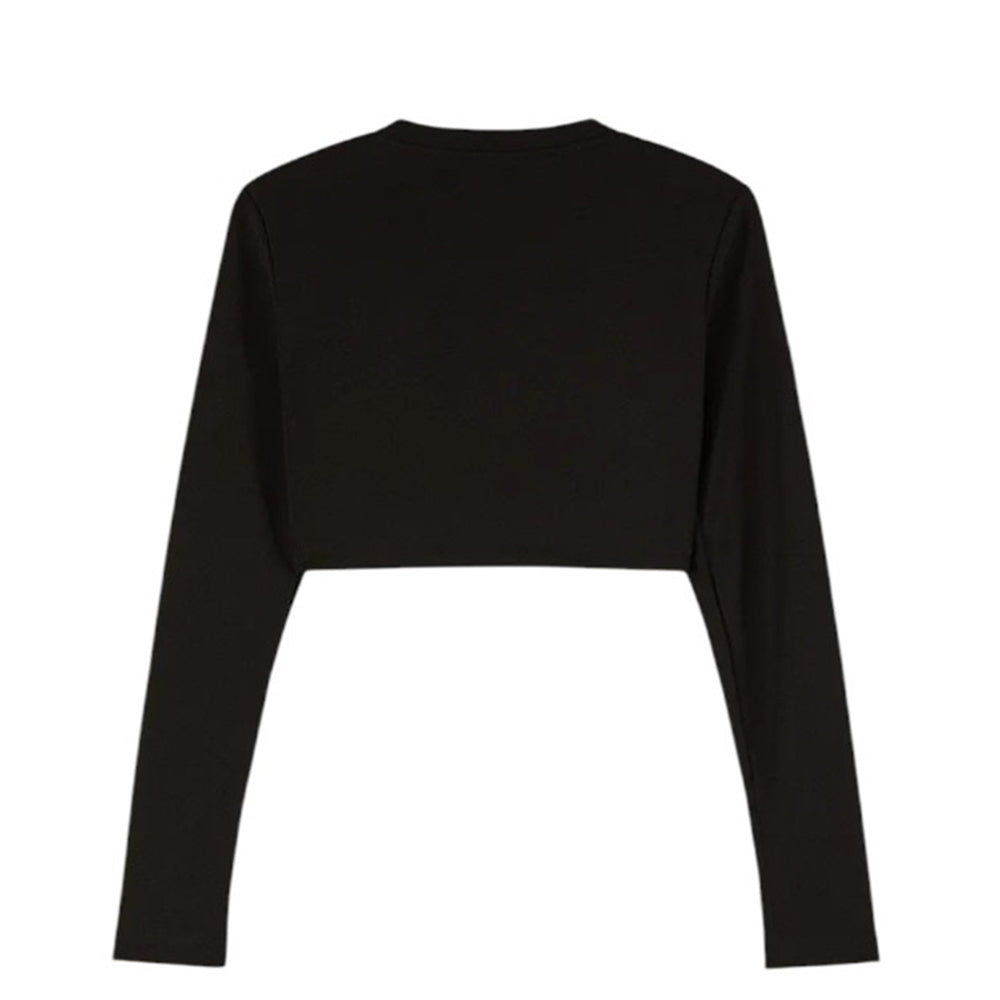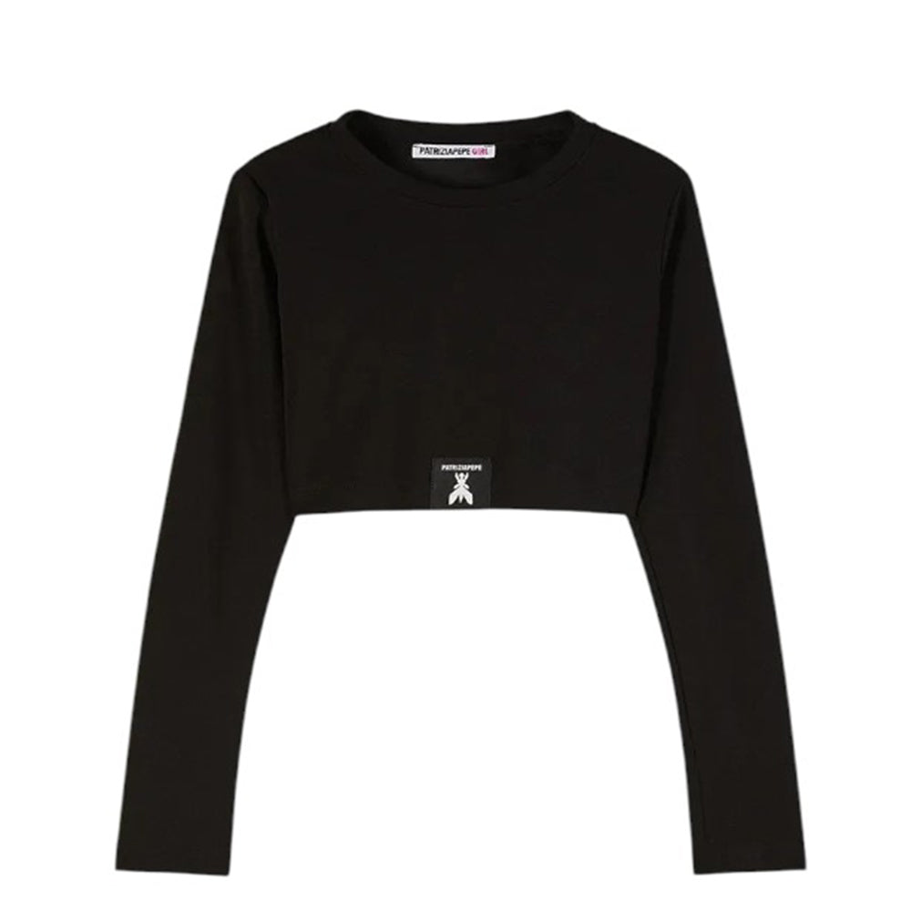T-shirt realizzata in jersey elasticizzato, caratterizzata da collo tondo, maniche lunghe, taglio cropped e orlo dritto. È decorato con patch logo applicata sul davanti.