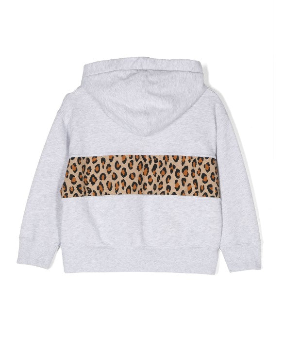 Long sleeve hoodie, low armhole, print on the front, spotted print on the back.