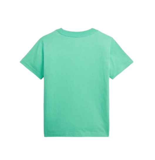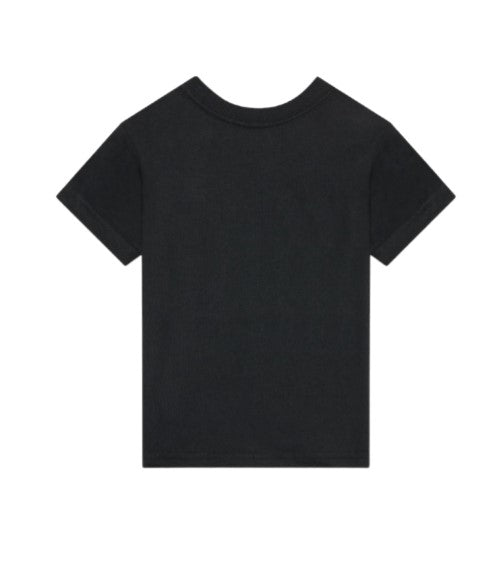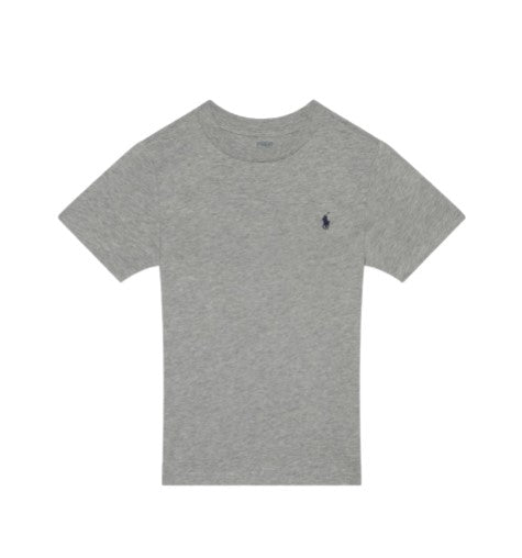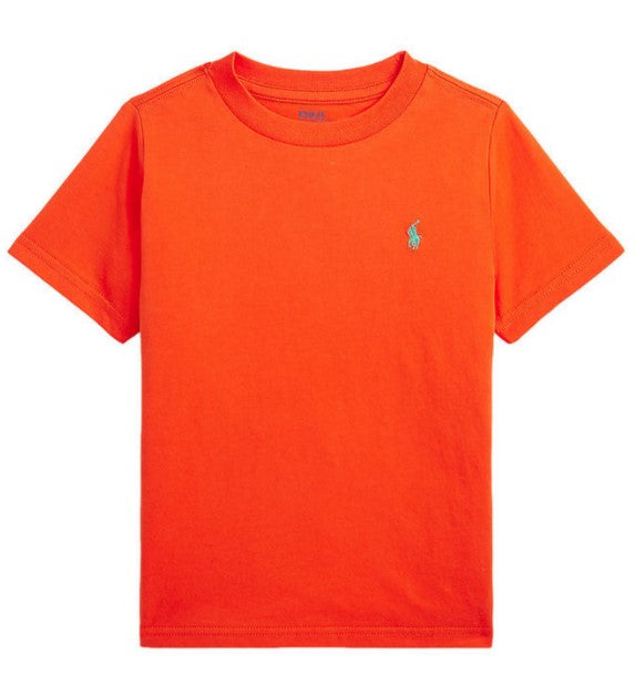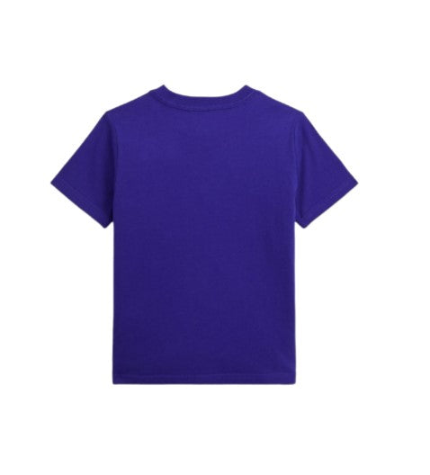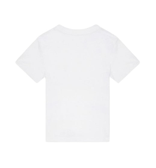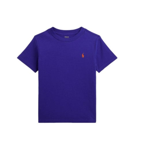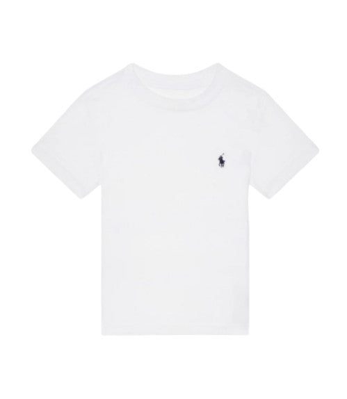 Children's short-sleeved cotton crew neck T-shirt with contrasting embroidered logo on the chest.