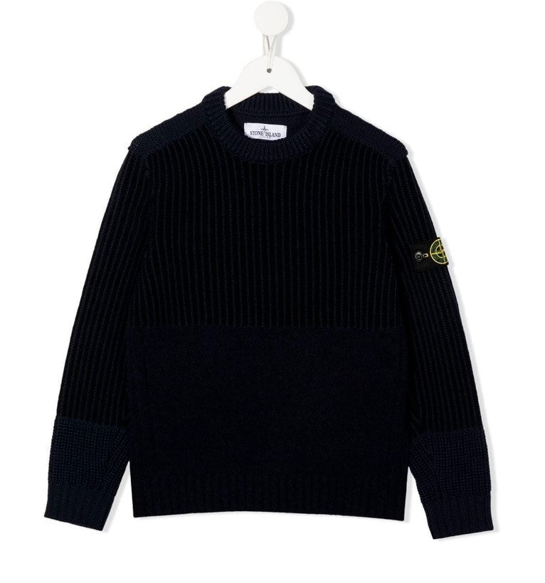 Children's crew neck wool sweater, ribbed knit, logo application on the sleeve.