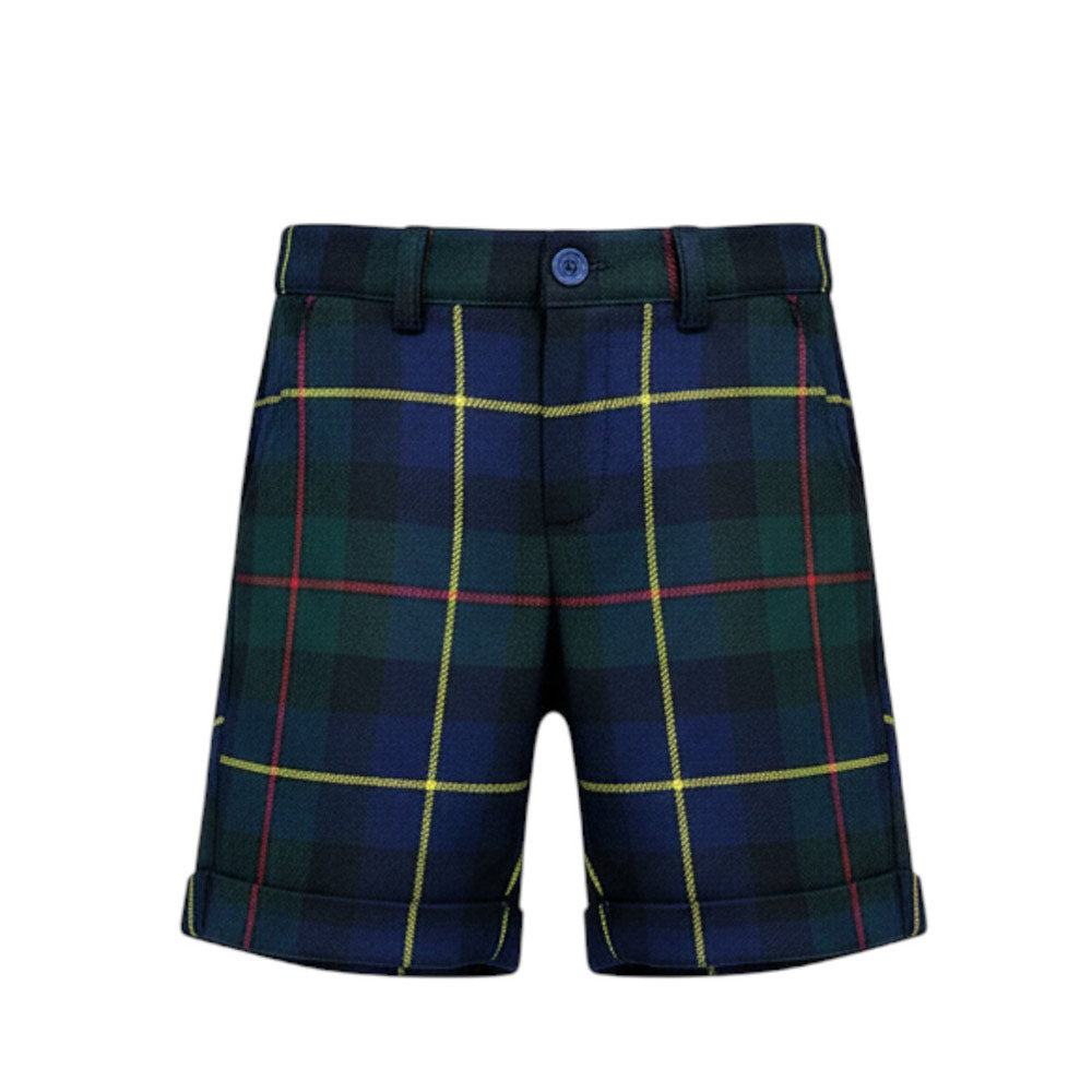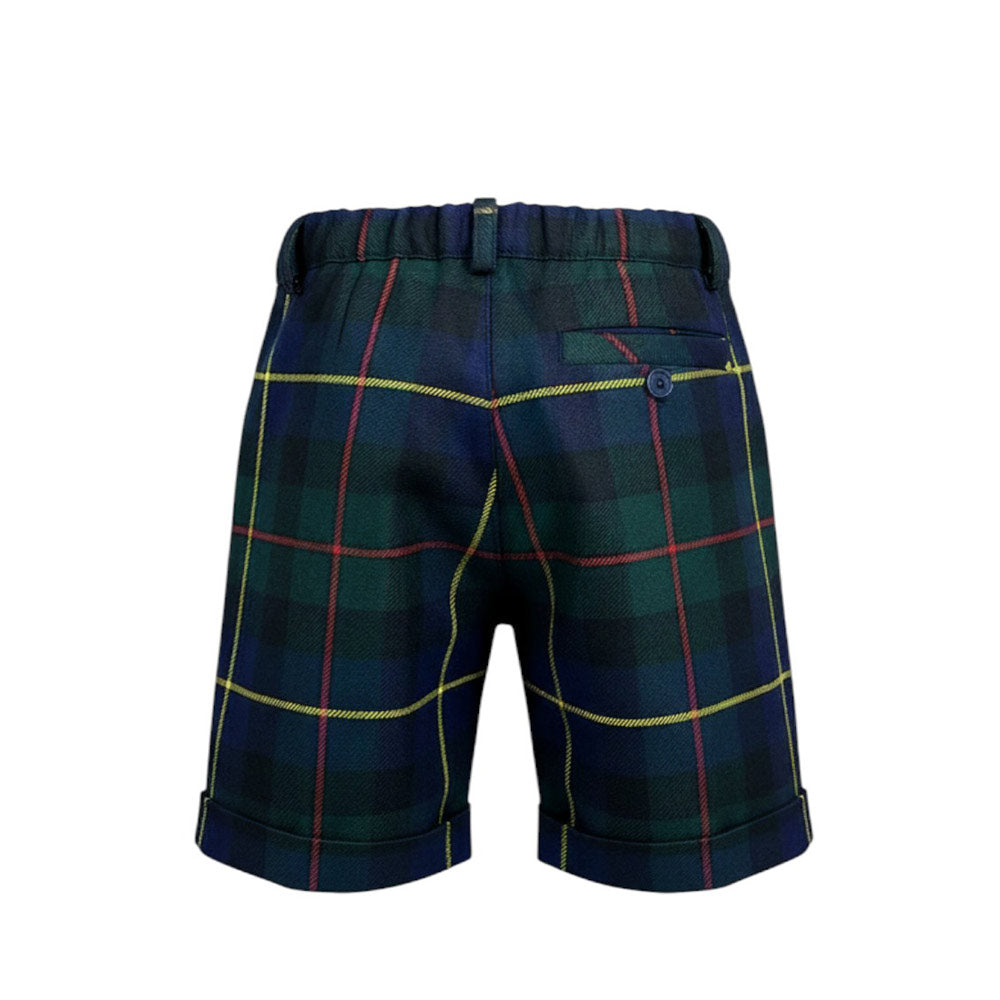 Bermuda realizzato in lana, con fantasia tartan da bambino. Presenta chiusura frontale con bottone e zip, vita regolabile grazie ad elastico interno con bottoncini, passanti per cintura, fodera all'interno, due tasche laterali all'americana, un taschino a filetto sul retro e fondo gamba con risvolto.