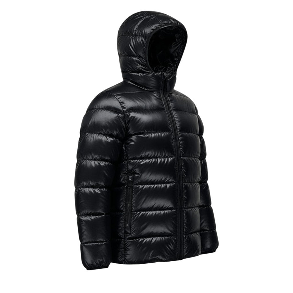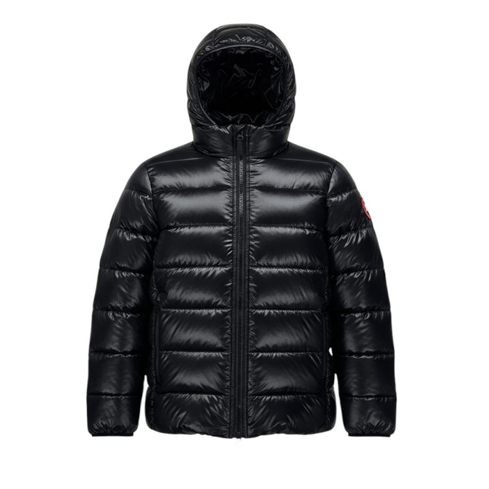 Quilted jacket with fixed hood, front zip fastening, side zip pockets, logo patch on the sleeve.