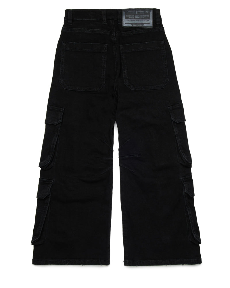 Jeans a cinque tasche dal fit straight e attitude street. A vita bassa. Realizzato in denim nero dal look pulito, contraddistinto da cuciture in tono e piccole abrasioni lungo le tasche. Tasche stile cargo applicate lungo le gambe. Chiusura frontale con bottone e zip, vita regolabile grazie ad elastico interno con bottoni a label logo applicata sul retro.