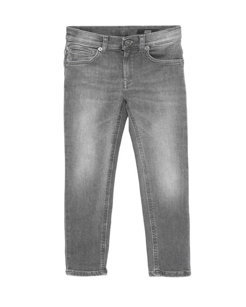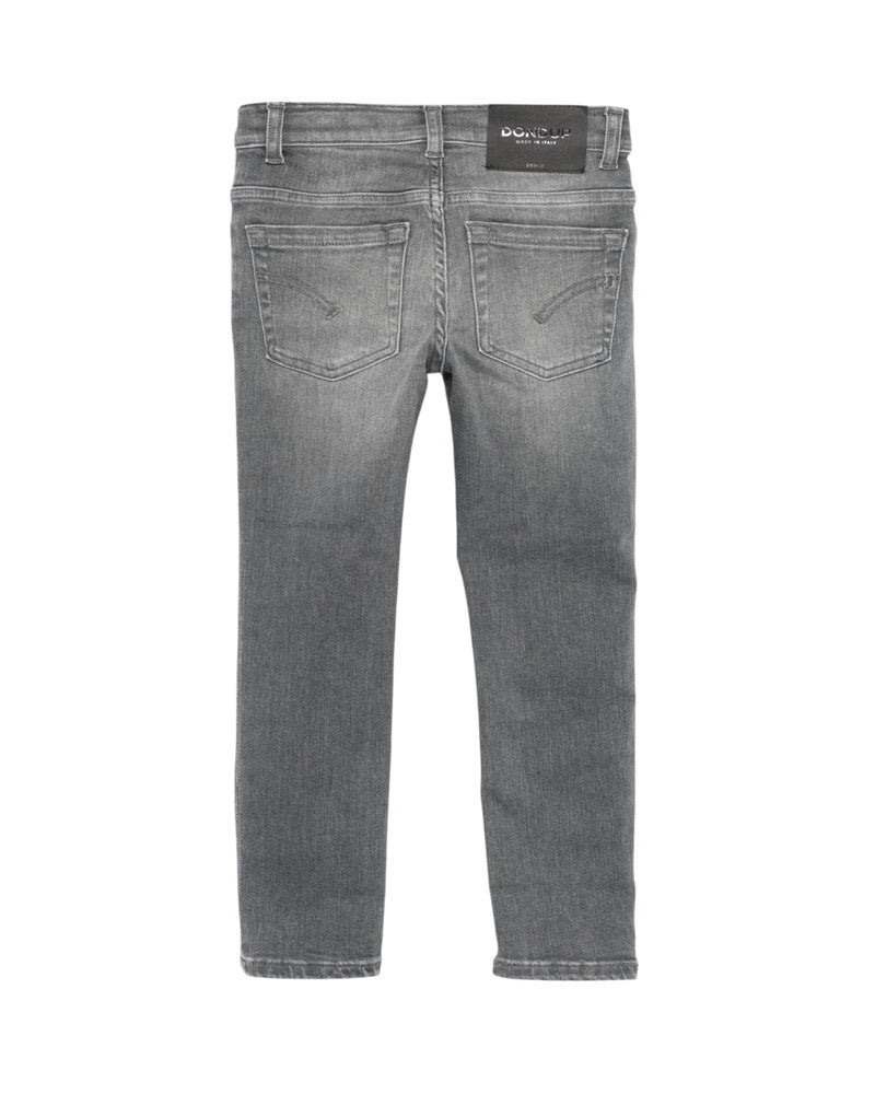 Jeans realizzati in denim di cotone stretch da bambino, modello cinque tasche. Presentano chiusura frontale con zip e bottone, passanti per cintura, vita regolabile grazie ad elastico interno con bottoni, patch logata e logo in metallo sulla parte posteriore.