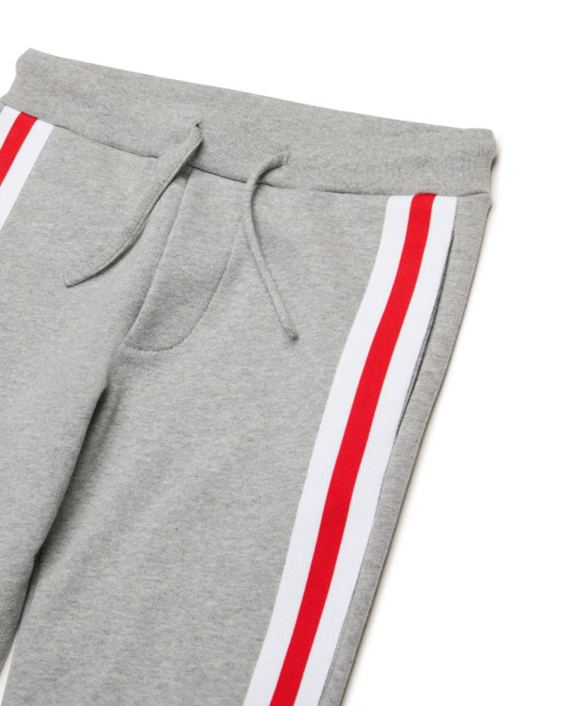 Pantaloni jogger realizzati in cotone sgarzato da bambino. Presentano vita elasticizzata con coulisse, bande laterali in maglia, tasche a filo, applicazione patch logo sul retro e fondo con elastico alla caviglia.