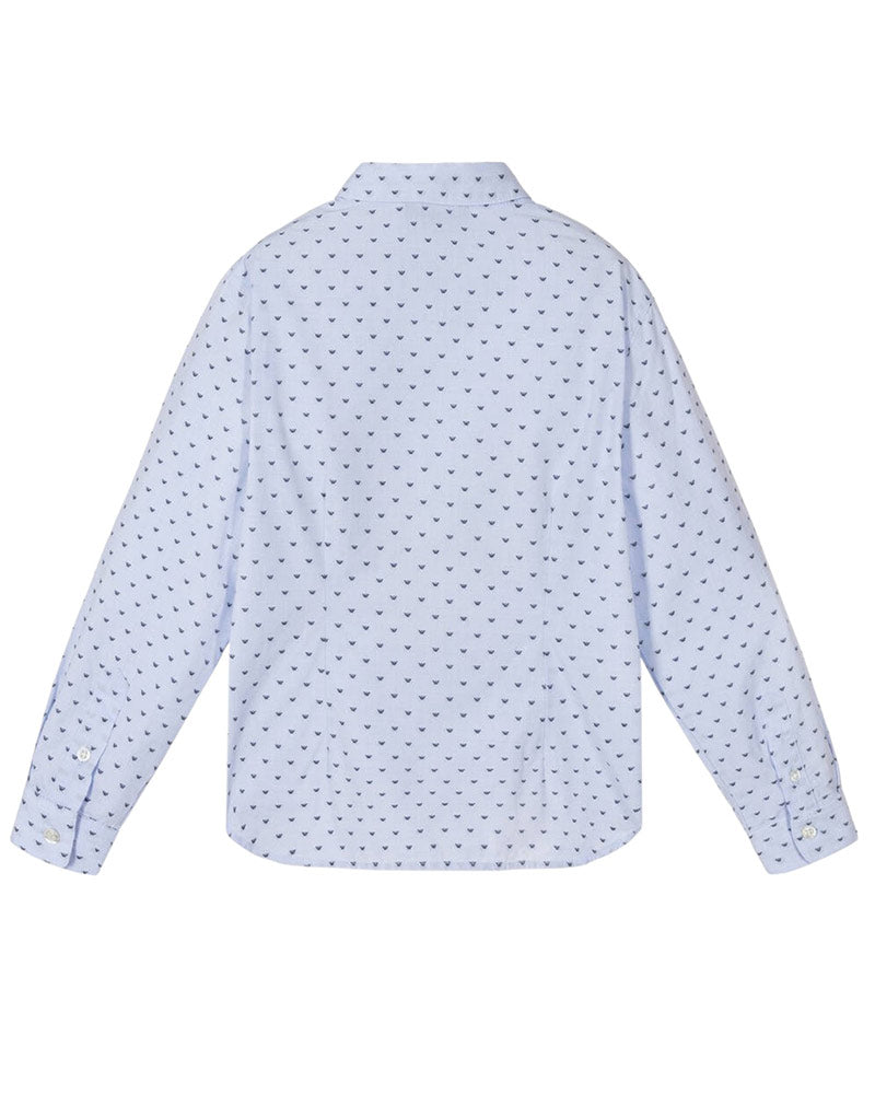 Camicia azzurra da bambino, realizzata in popeline di cotone. Presenta colletto a punta, chiusura frontale con bottoni e maniche lunghe. È decorata con micro stampa iconica di aquila all-over.