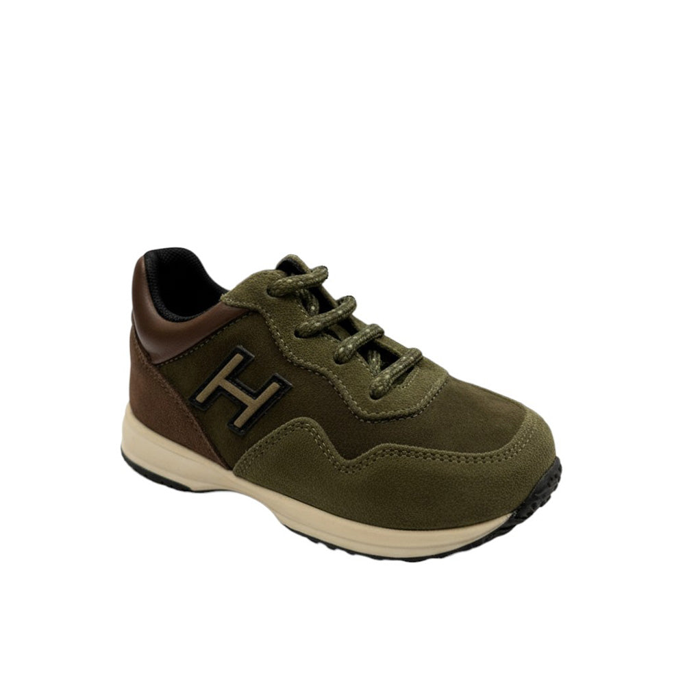 La tomaia è realizzata in una combinazione di pelle scamosciata verde militare e inserti in tela o tessuto tono su tono. Il modello presenta una classica allacciatura con lacci verdi e il logo “H” iconico del brand applicato lateralmente in pelle scamosciata, rifinito da un bordo marrone scuro. Una pratica zip laterale facilita ulteriormente la calzata.