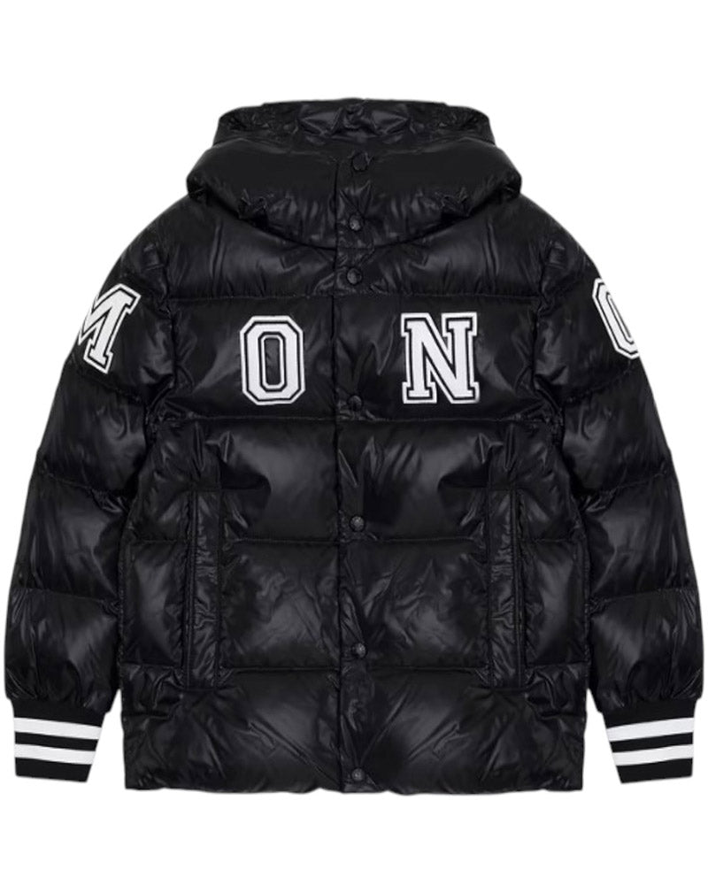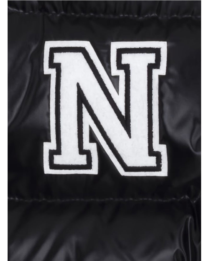Quilted jacket with hood, front zip fastening, side pockets with clips, maxi contrasting logo.