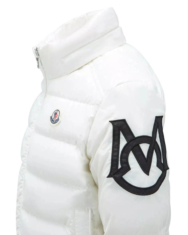 Quilted jacket with removable hood, front zip fastening, side pockets with clips, logo patch application on the sleeve.