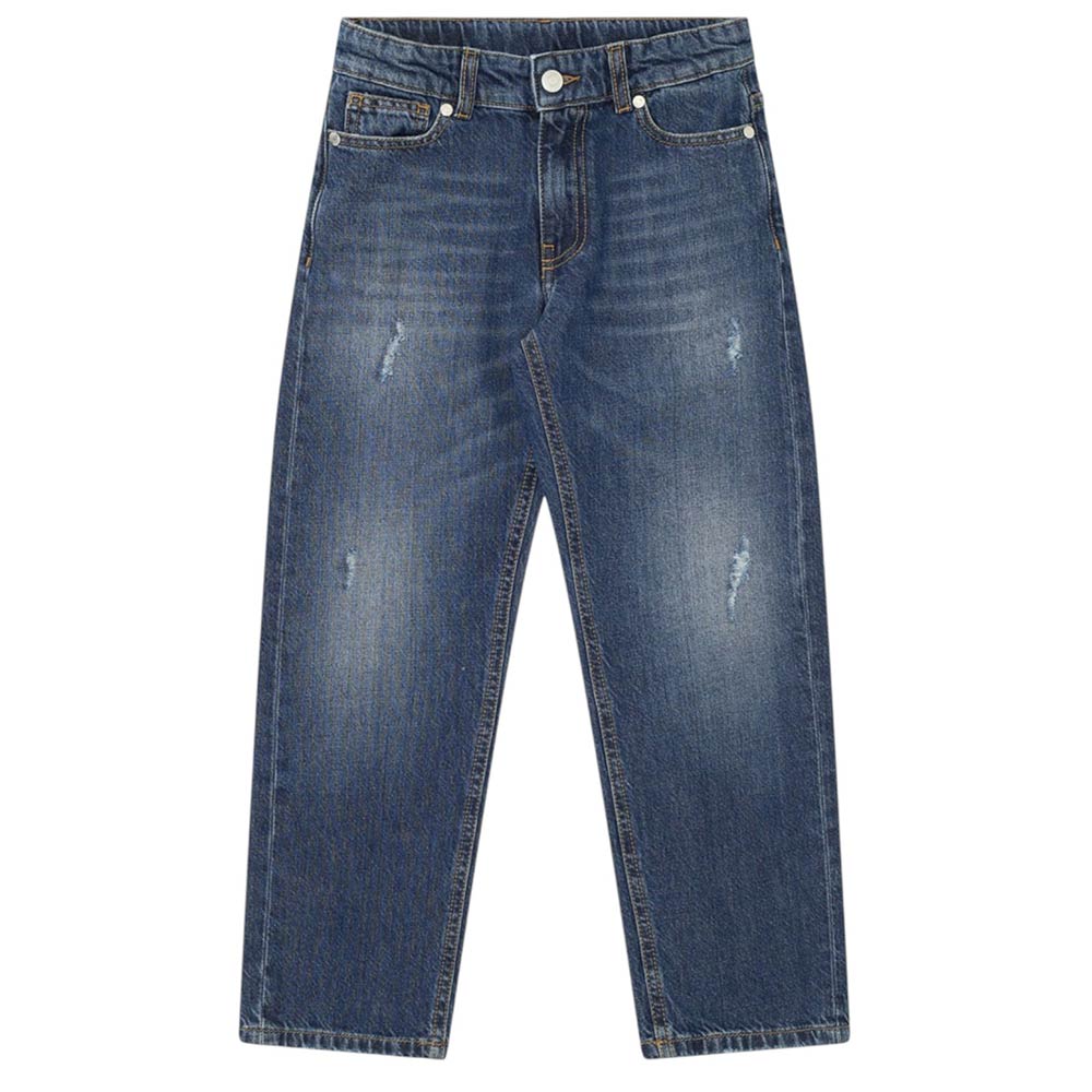 Jeans Regular Fit realizzati in denim blu con dettagli destroyed. Modello cinque tasche. Chiusura frontale con bottone e zip, passanti per la cintura e vita regolabile grazie ad elastico interno con i bottoni.
