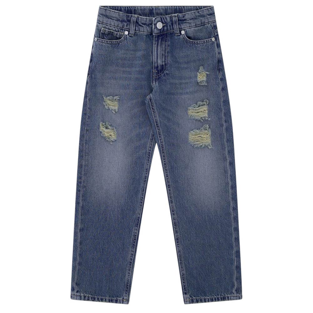 Jeans Regular Fit realizzati in denim blu con dettagli destroyed. Modello cinque tasche. Chiusura frontale con bottone e zip, passanti per la cintura e vita regolabile grazie ad elastico interno con i bottoni.