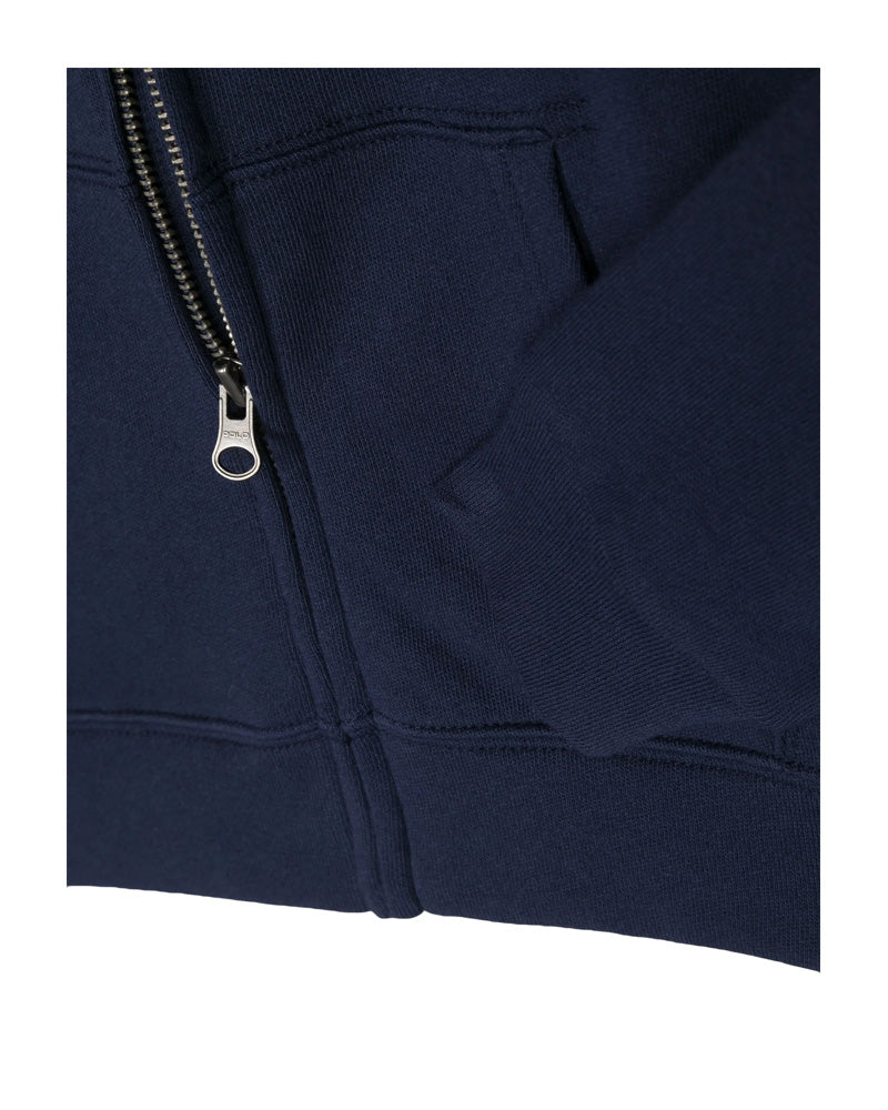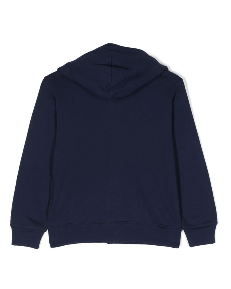 Felpa in cotone con cappuccio, chiusura frontale con zip, tasca a marsupio, logo ricamato in contrasto.
