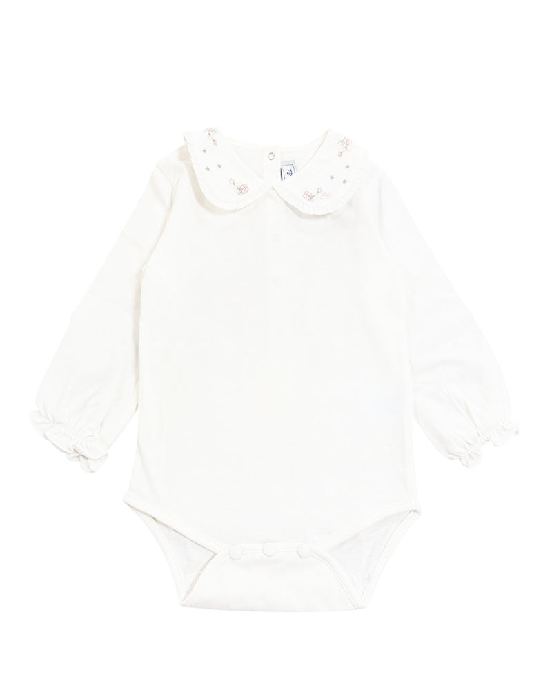 Body realizzato in morbido cotone da neonata. Presenta colletto tondo con ruches, maniche lunghe con polsini elasticizzati, chiusura con bottoncini automatici sul retro e tra le gambe.