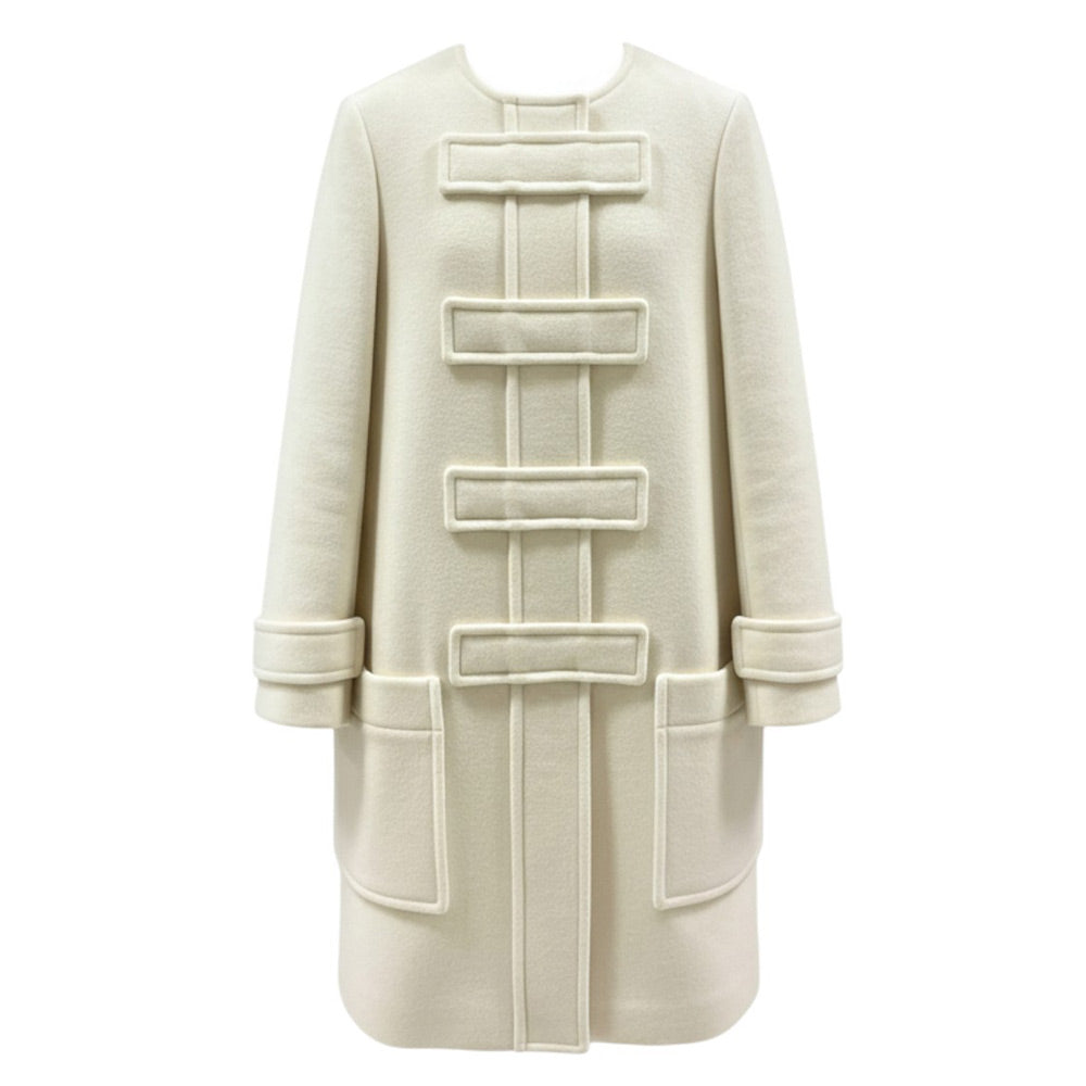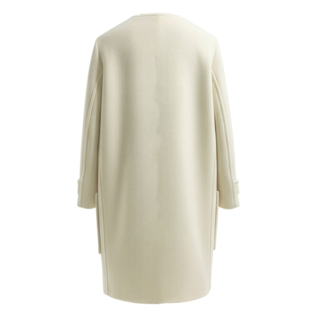 Cappotto monopetto da donna realizzato in panno di lana vergine. Presenta collo rotondo, chiusura frontale nascosta con bottoni a pressione, maniche lunghe, due tasche applicate sul davanti e orlo dritto.