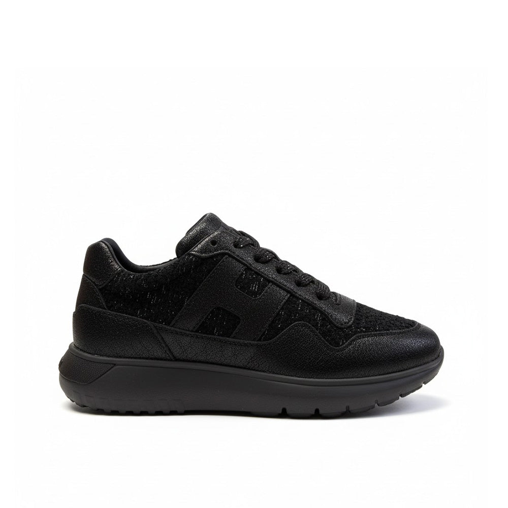 La tomaia è realizzata in pelle con eleganti inserti glitterati. Il logo Hogan, a forma di “H”, è applicato lateralmente
