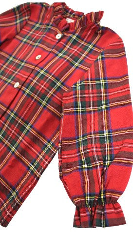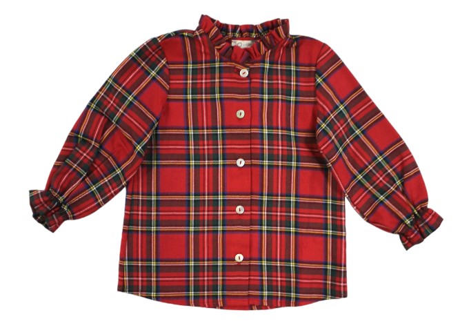 Tartan shirt, button fastening, gathered collar and cuffs.