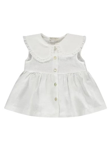 Linen shirt with armholes, round collar with ruffles, front fastening with buttons.