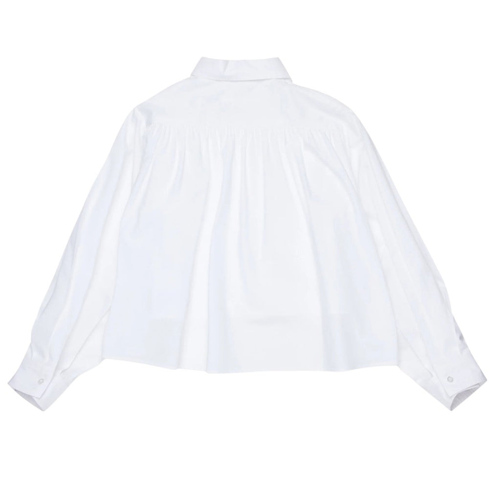 Camicia realizzata in popeline di cotone, con schiena plissettata. Presenta colletto a punta, chiusura frontale con bottoni, maniche lunghe a sbuffo e orlo asimmetrico. È decorata con Numeric Logo ricamato tone on tone sul davanti.