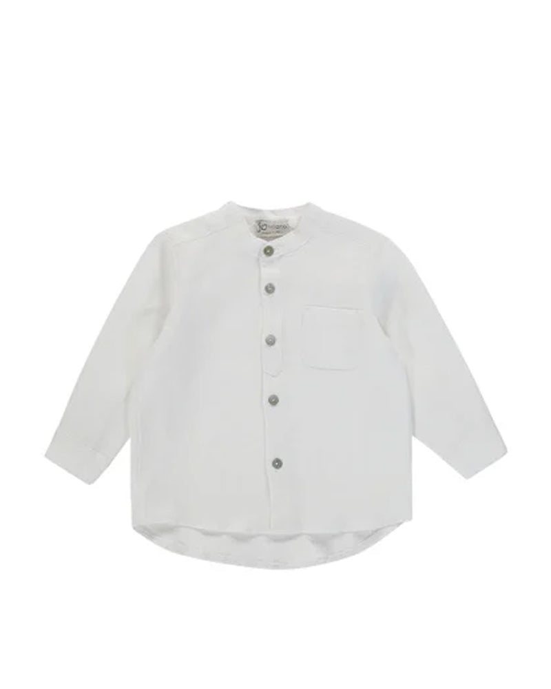 Camicia in misto lino a manica lunga, collo alla coreana, abbottonatura frontale, taschino applicato sul petto.