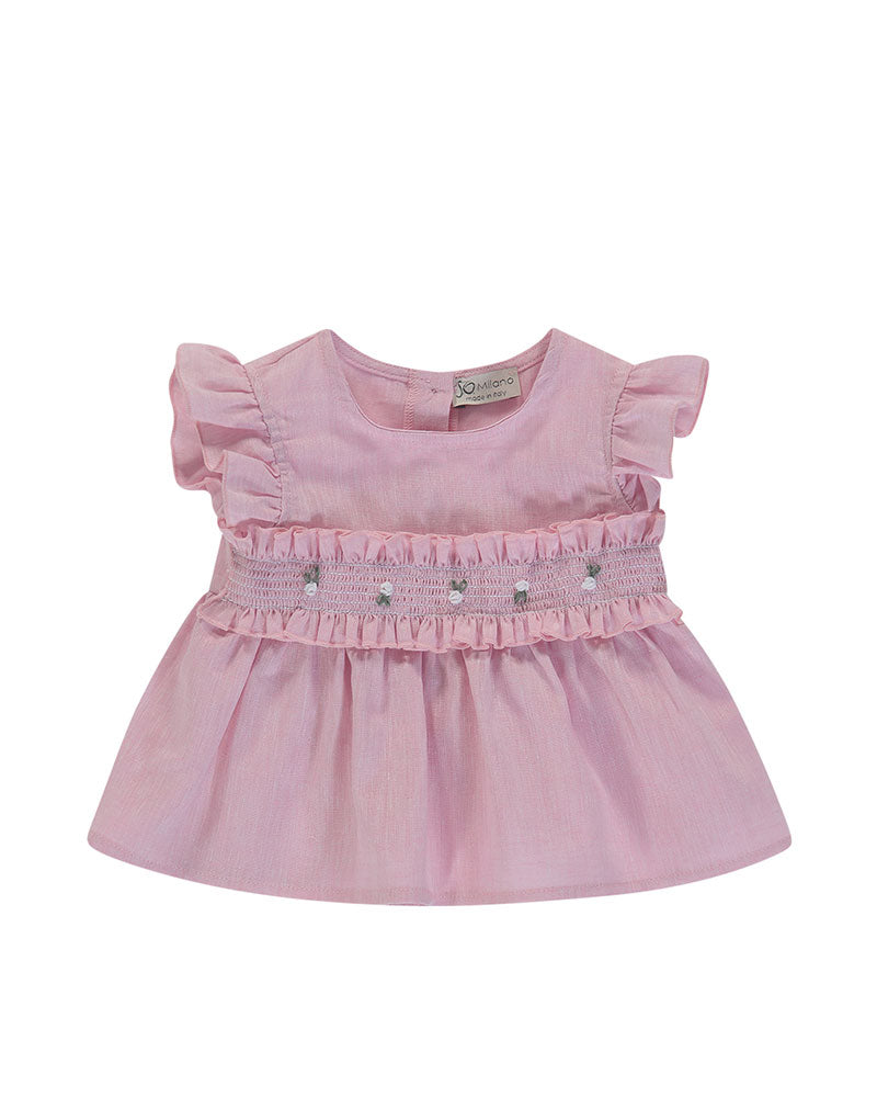 Camicia girocollo realizzata in puro lino, abbottonatura sul retro, maniche con ruches, ricamo punto smock.