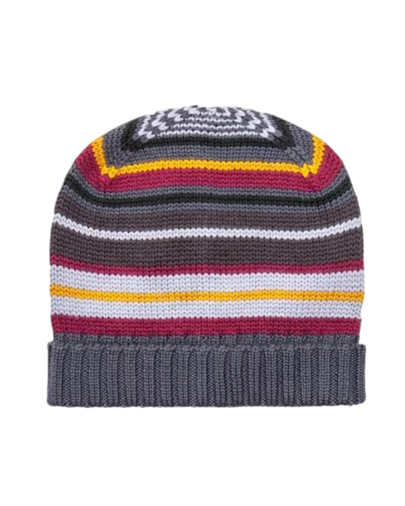 Cappello da bambino realizzato in lana, caratterizzato da fantasia a righe, lavorazione a coste e orlo con risvolto.