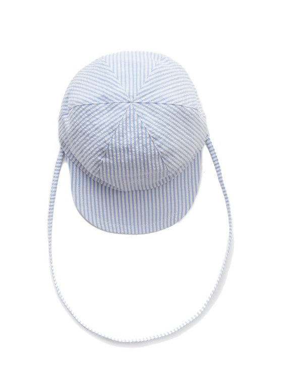 Cap with visor and drawstring, striped pattern, elastic on the back, embroidered logo on the front.
