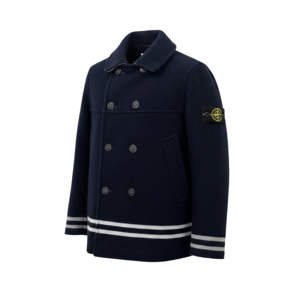 Double-breasted coat, button fastening, patch pockets, logo on the back.