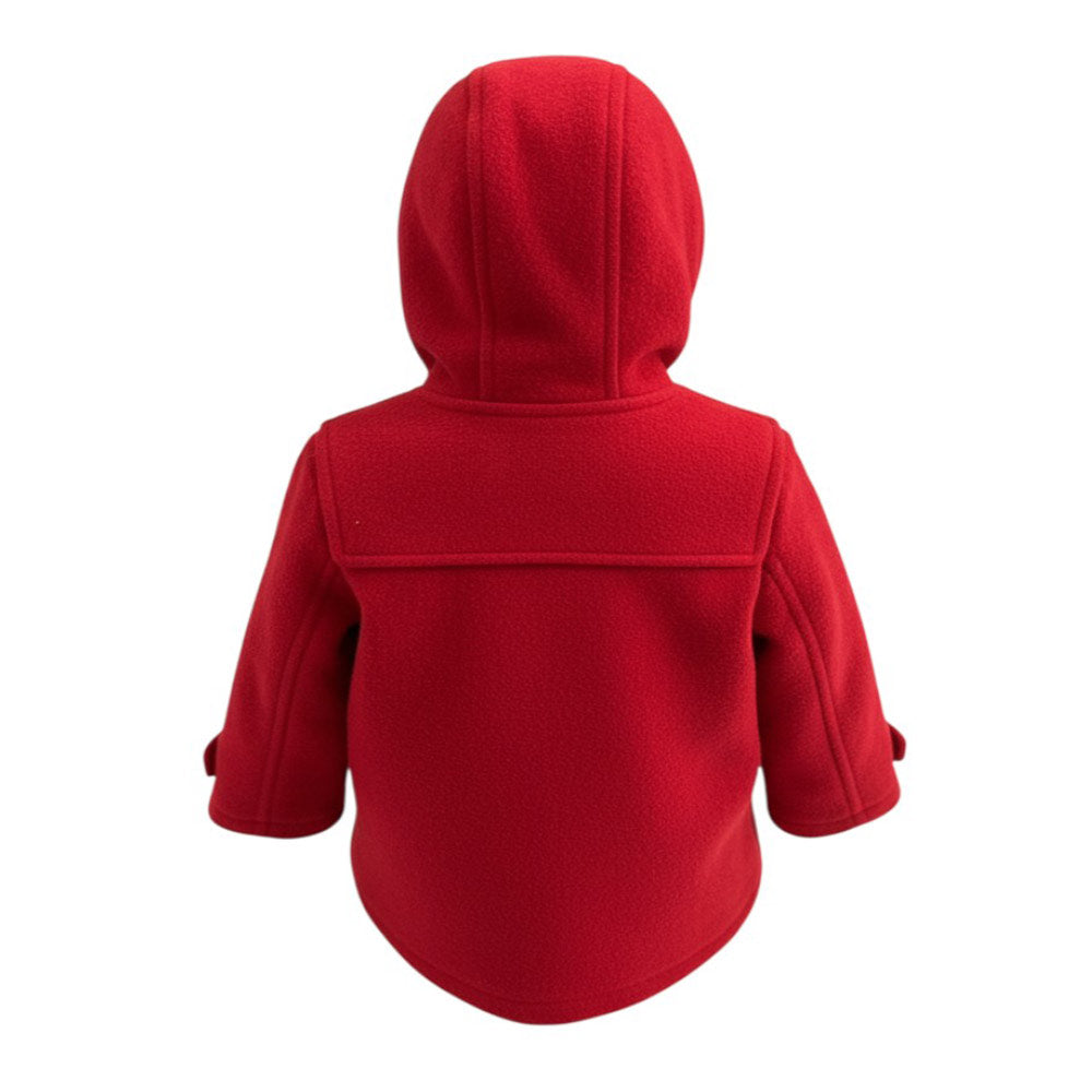 Montgomery style coat, fastening with toggles and zip, fixed hood, pockets with flaps.