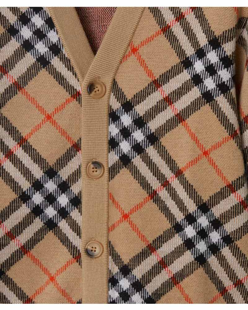 Cardigan in lana con iconica fantasia Burberry Check in jacquard, caratterizzato da scollo a V, maniche lunghe, chiusura frontale con bottoncini e finiture a costine.