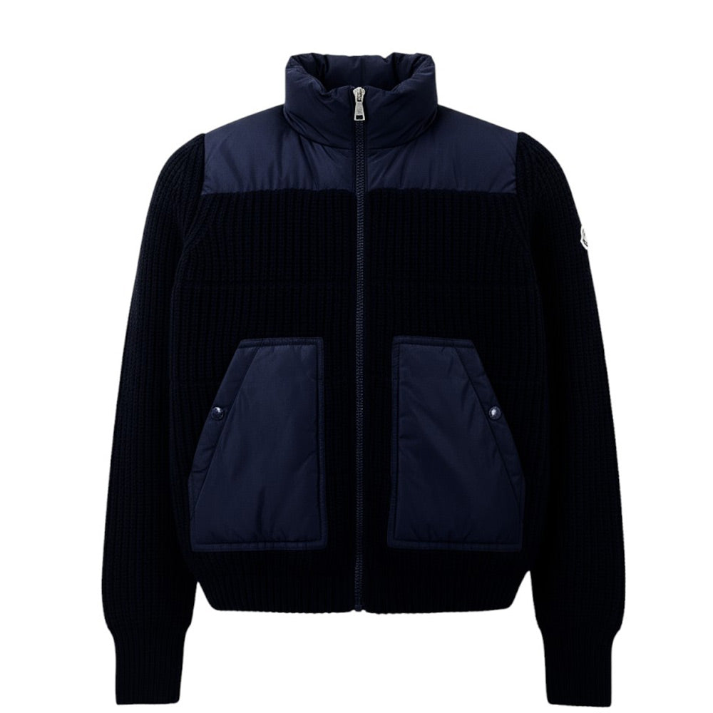 Padded children's cardigan, front zip fastening, patch pockets with clips, logo patch on the sleeve.