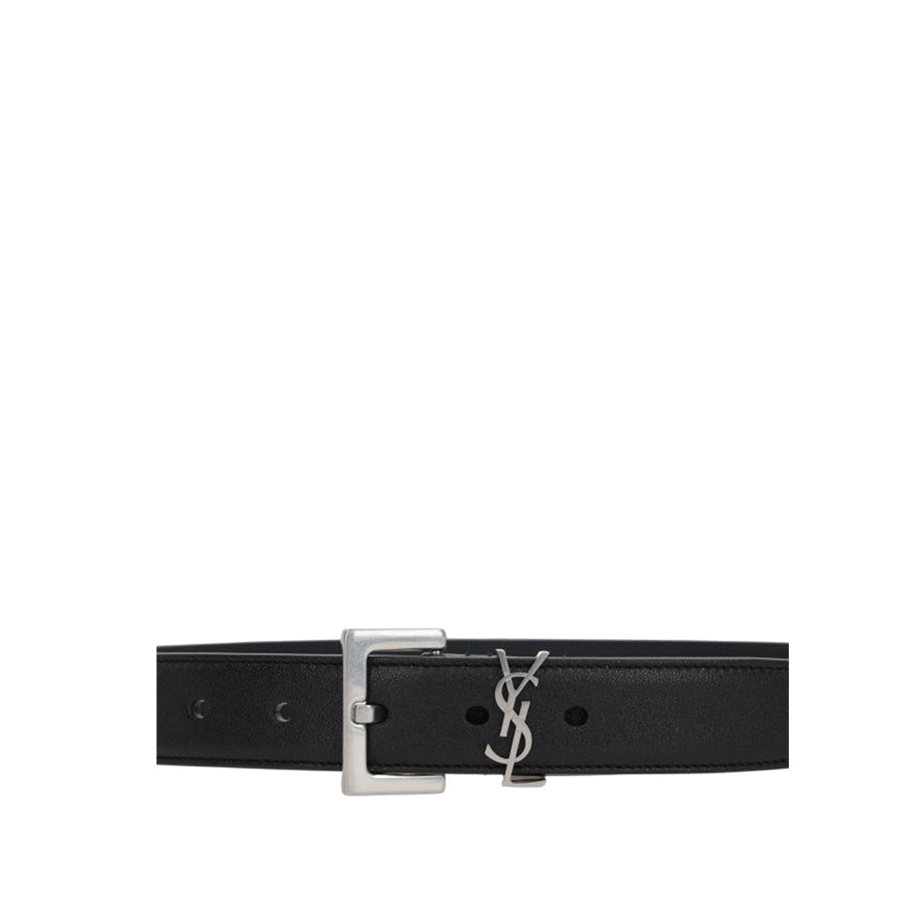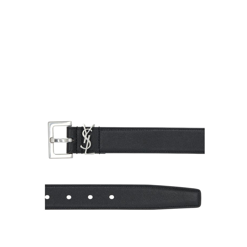 Cintura YSL in pelle conciata senza metalli, con fibbia quadrata regolabile e passante con monogramma.