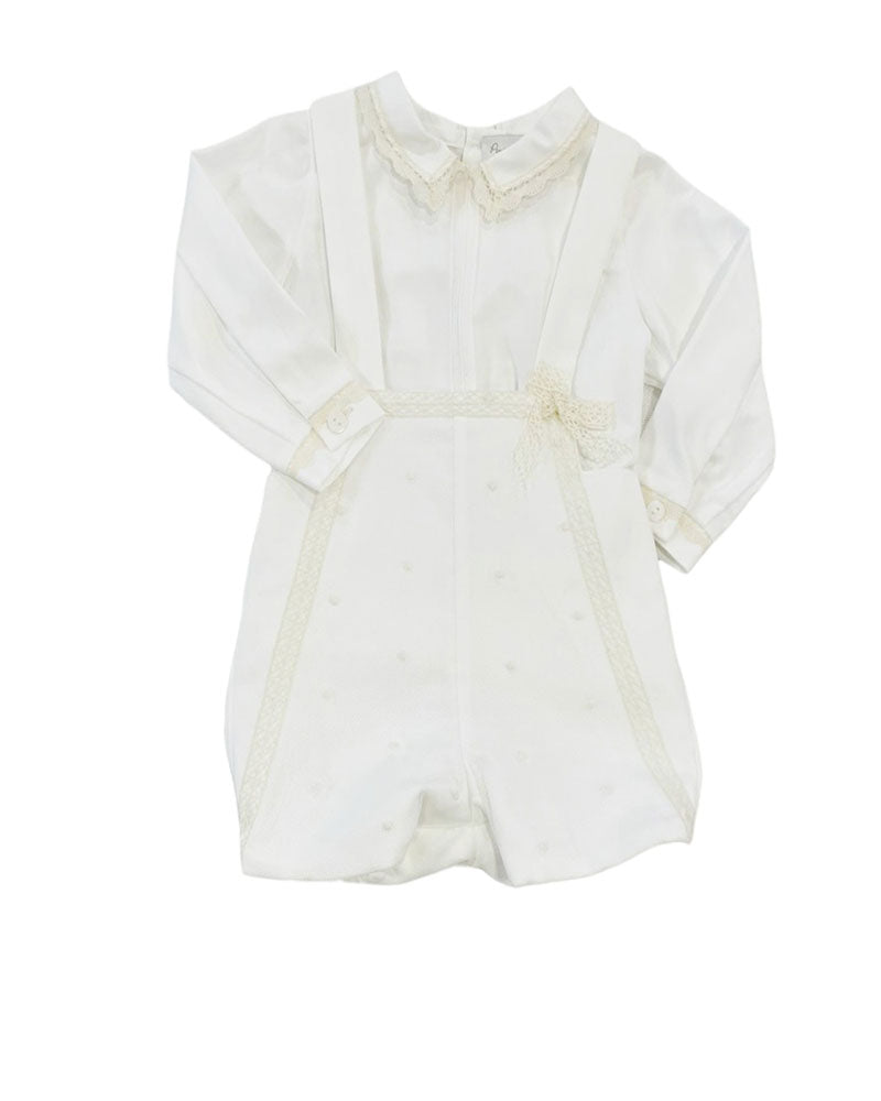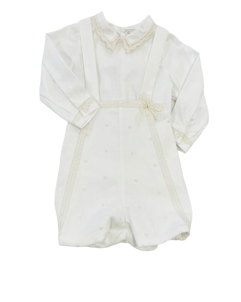 con camicina maniche lunghe e colletto in pizzo, pantaloncino corto con bretelle e dettagli in pizzo