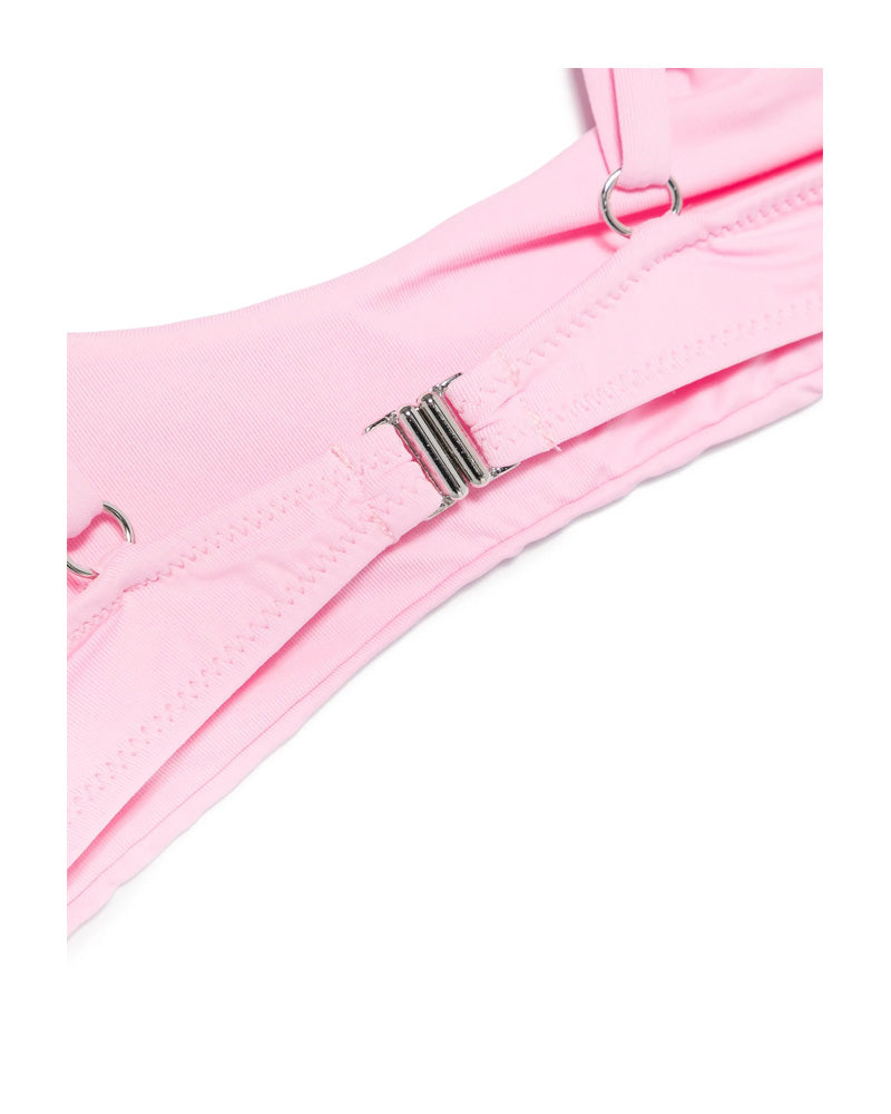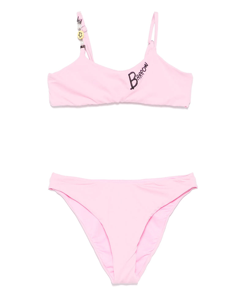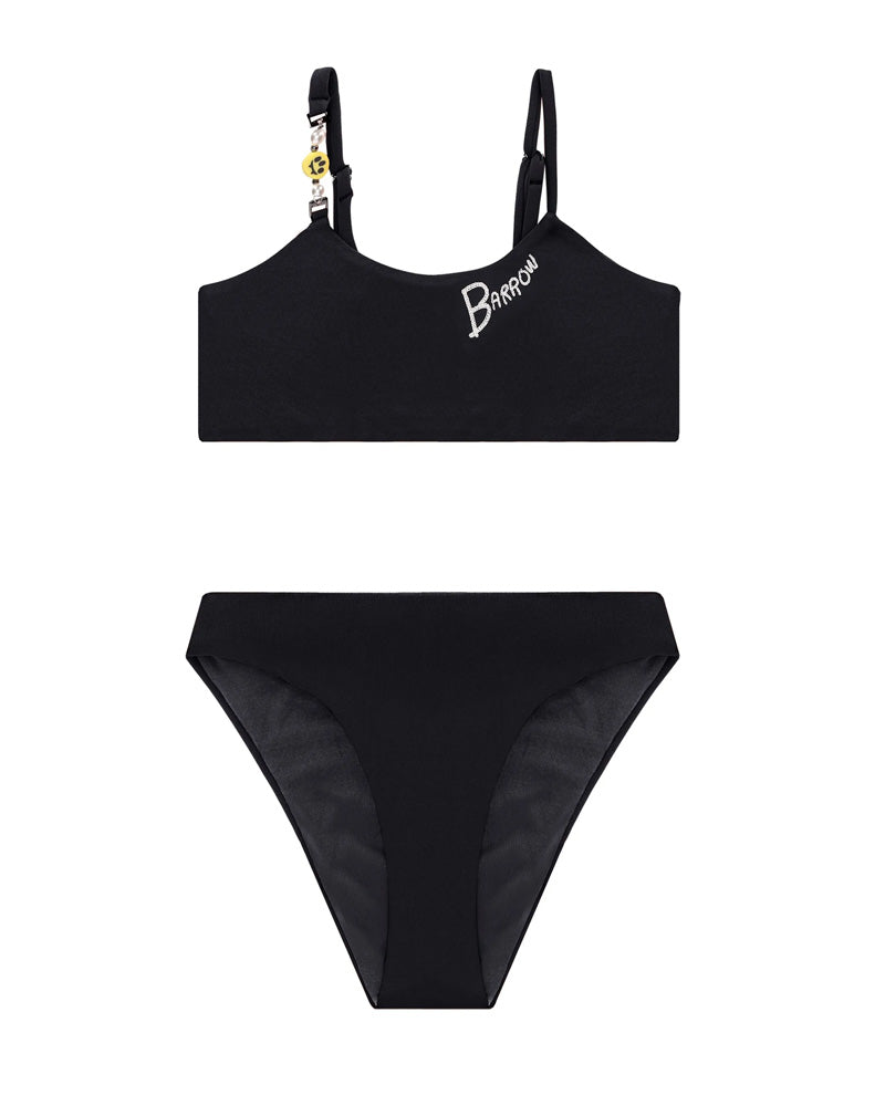 Costume due pezzi bambina composto da top e slip. Top con spalline regolabili, chiusura con gancio sul retro e logo ricamato; Slip con elastico in vita e patch smile applicato sul retro.