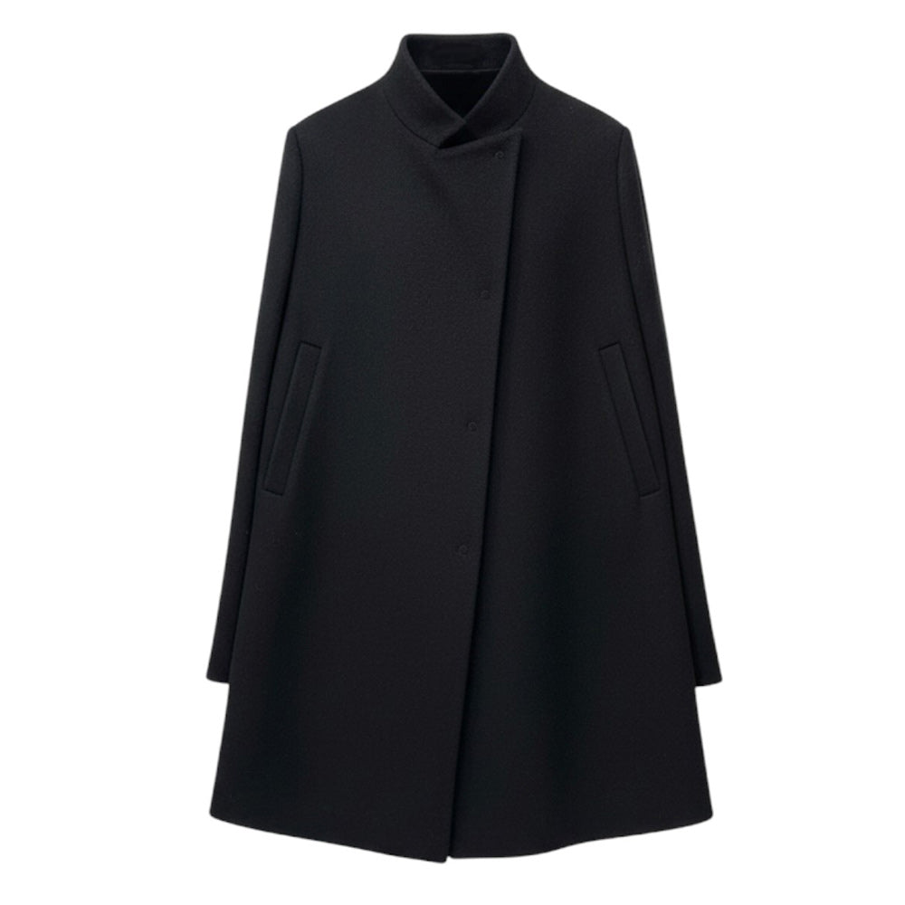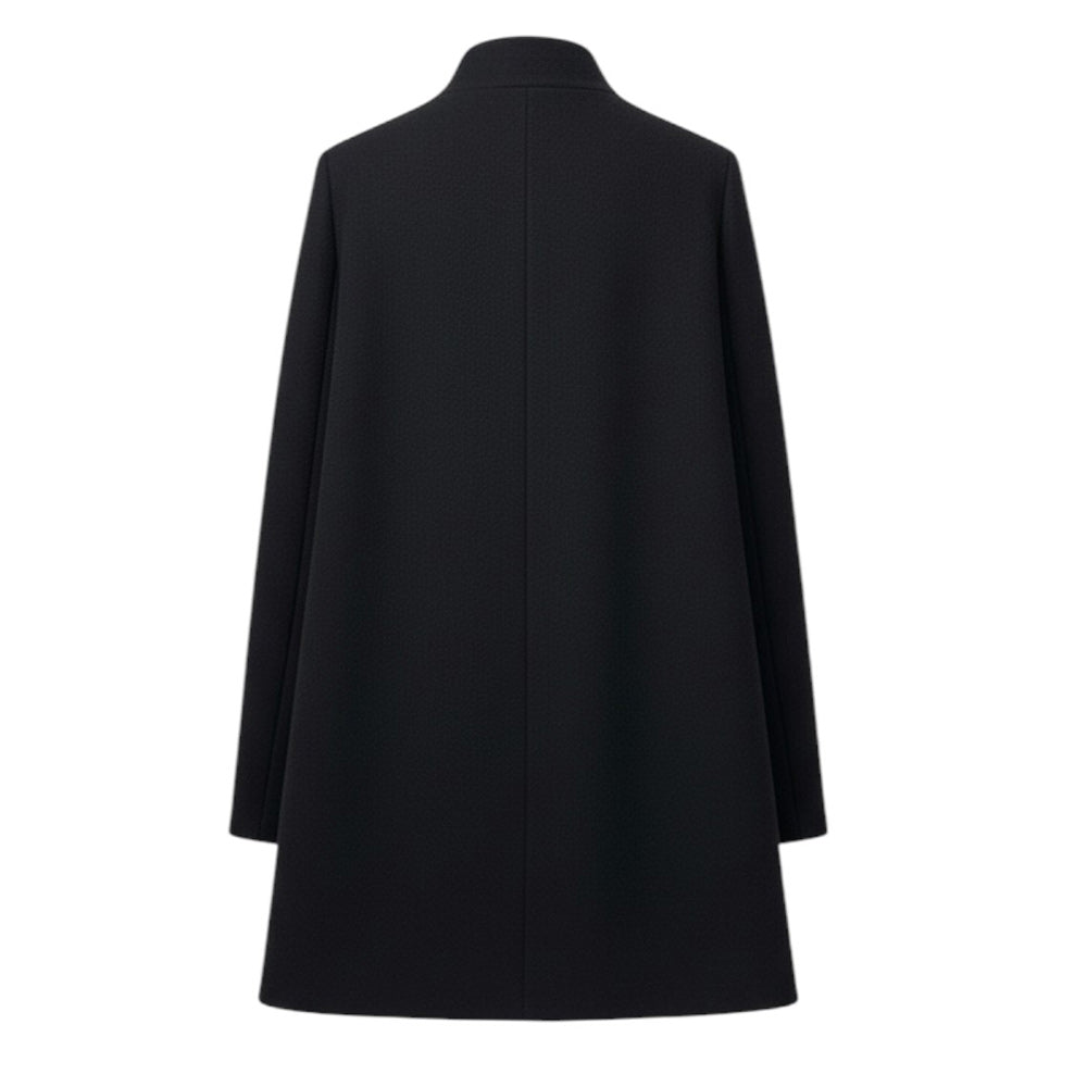 Cappotto realizzato in panno di misto lana, caratterizzato da collo alto, chiusura frontale con bottoni a pressione, maniche lunghe, due tasche laterali a filetto e orlo dritto.