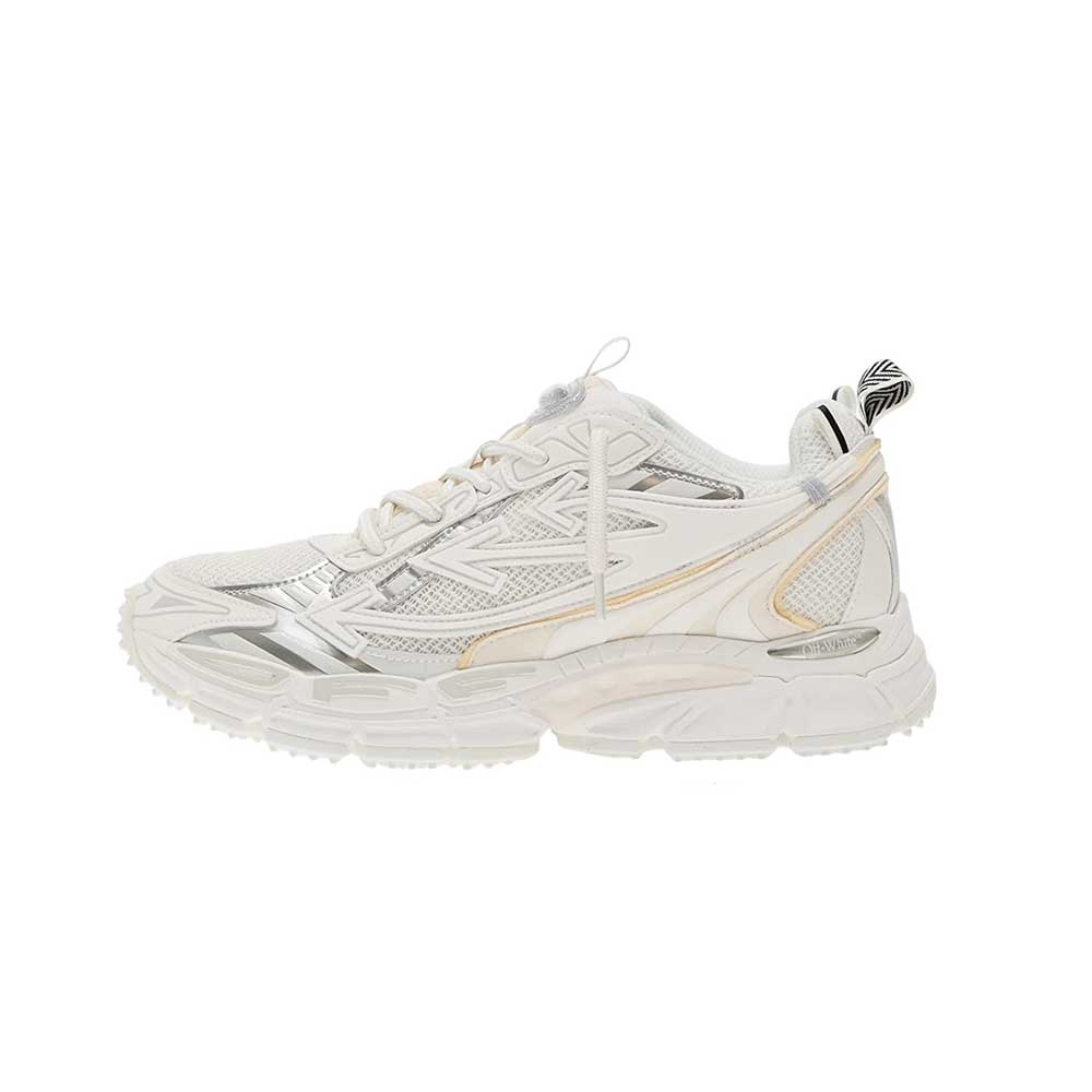 Le sneakers Off-White Be Right Back unisex combinano estetica running a un design versatile, pensato per performance ottimali. Realizzate con inserti in mesh e pelle sintetica, garantiscono traspirabilità e resistenza. Le diverse applicazioni del logo Off-White™ e la nuova versione del motivo a freccia conferiscono un carattere distintivo e moderno, ideale per chi cerca stile e funzionalità in ogni contesto urbano.