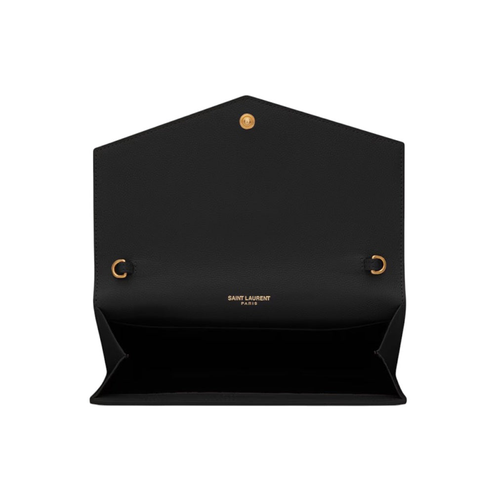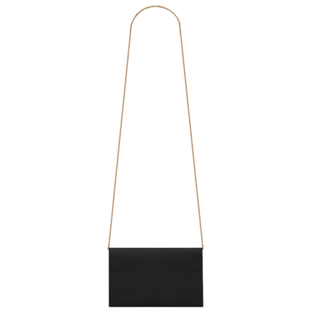 Presenta una tracolla a catena amovibile, permette di indossarla a spalla o a mano come pochette. Patta frontale con chiusura magnetica e logo metallico color oro. Fodera in pelle e una tasca interna applicata. Il modello è dotato di portacarte.