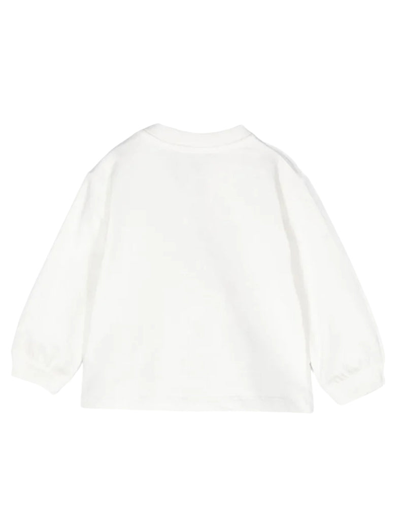 Crewneck sweatshirt in soft fleece cotton with clip closure on the shoulder strap and ruffles on the neck, cuffs and bottom. Glitter print of the logo and the adorable Teddy bear. Perfect for a casual but trendy style. Comfortable and versatile for any occasion. Composition: 100% cotton.
