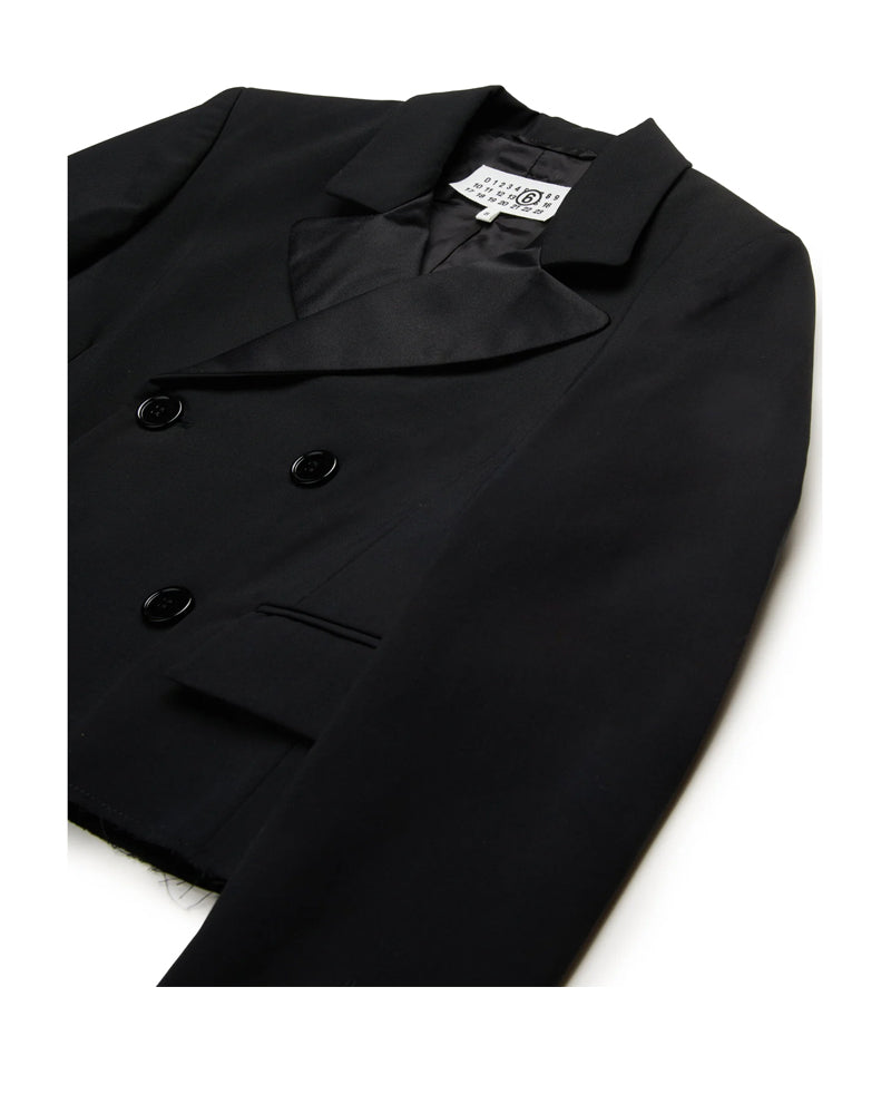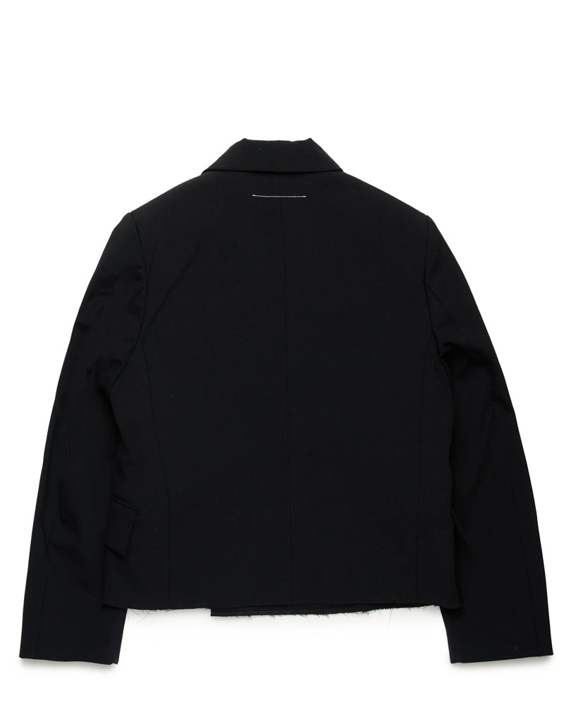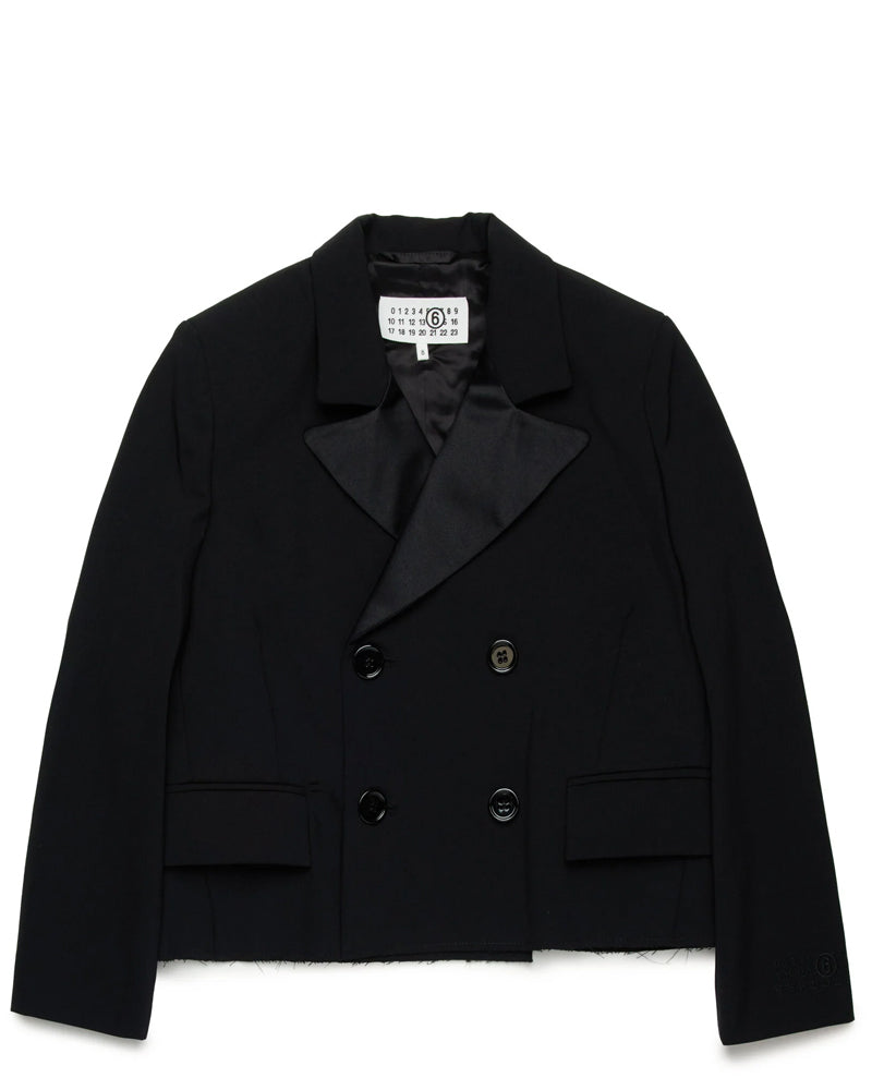 Giacca doppiopetto nera realizzata in fresco di lana. Presenta collo a revers in raso lucido, chiusura frontale con bottoni, maniche lunghe, due tasche con patta applicate sul davanti e dettagli raw edge sul fondo. È decorata con logo ricamato tone on tone sulla manica.
