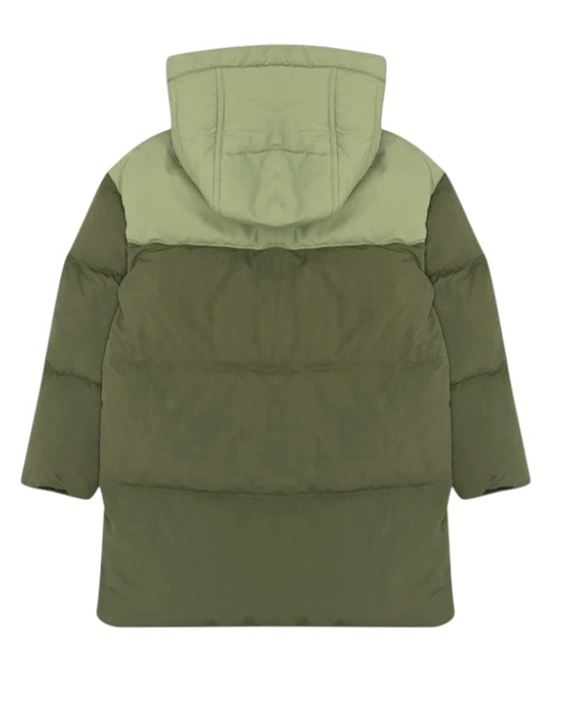 Giubbino imbottito da bambino realizzato in nylon. Presenta design trapuntato, cappuccio fisso, maniche lunghe con polsi elasticizzati, chiusura frontale con zip e bottoni a pressione, due tasche laterali a filo e orlo dritto. È decorato con logo ricamato sul petto.