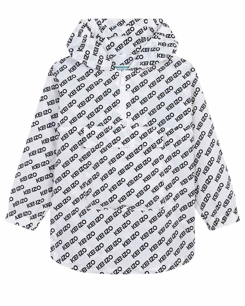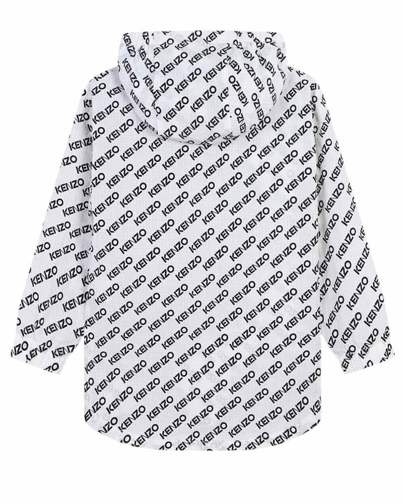 Giubbino antivento bianco da bambino realizzato in nylon. Presenta motivo logo jacquard all-over, cappuccio fisso, chiusura frontale con zip, maniche lunghe con polsi elasticizzati e tasca a marsupio sul davanti.