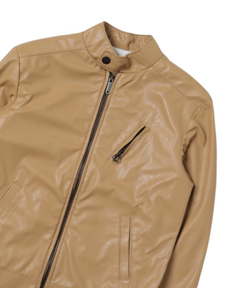 Giubbino da bambino realizzato in similpelle. Presenta collo alla coreana con bottone di chiusura, maniche lunghe, chiusura frontale con zip, due tasche frontali a filo e un taschino a filo sul petto.