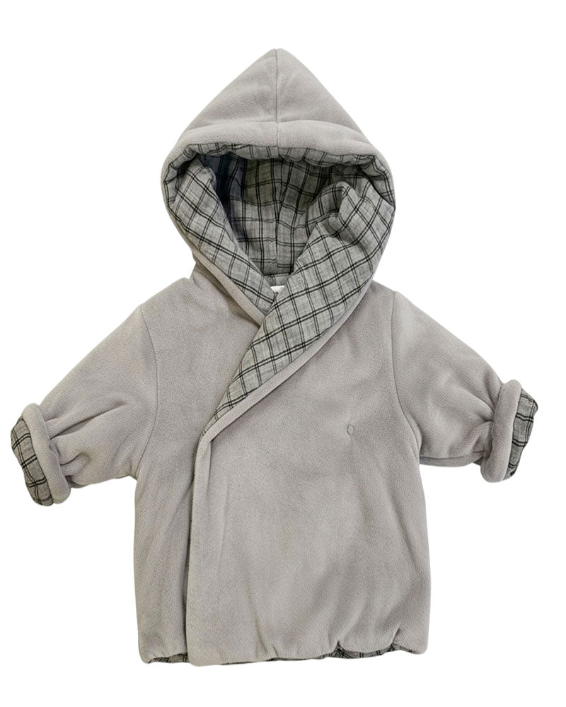 Giubbino con cappuccio in ciniglia e stoffa reversibile abbottonatura ad incrocio taschine laterali