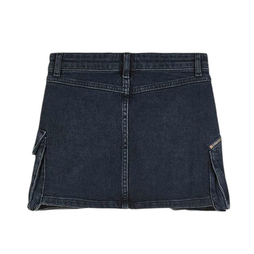 Gonna realizzata in denim blu scuro, caratterizzata da chiusura frontale con bottone e zip, vita regolabile grazie ad elastico interno con bottoni, passanti per la cintura, due tasche laterali oblique e tasche cargo ai lati. È decorata con logo ricamato sul davanti.